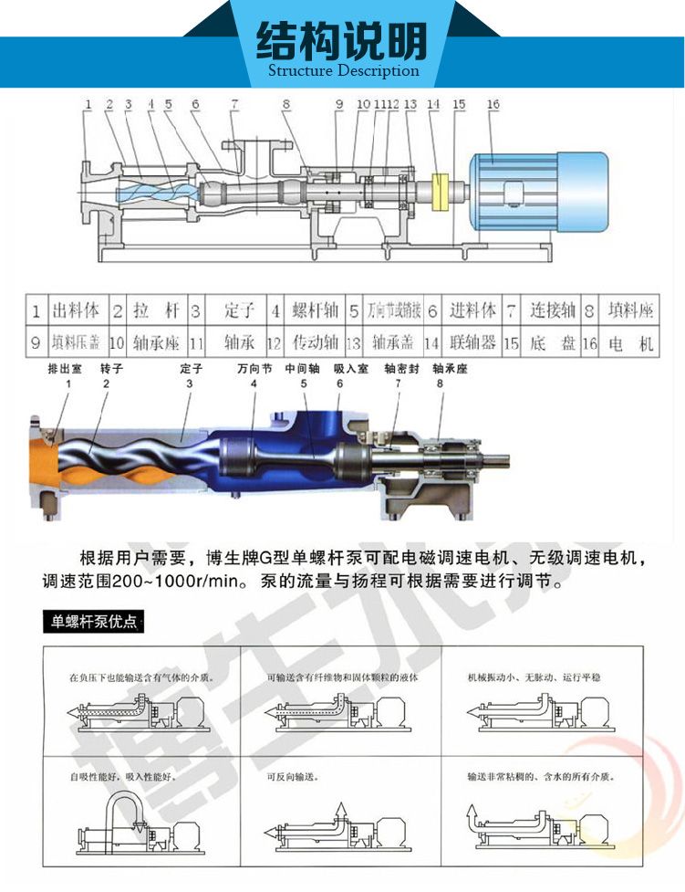 博生牌G型單螺桿泵在發(fā)達國家已廣泛使用,由于其優(yōu)良的性能,近年來在國內(nèi)的應用范圍也在迅速擴大。它的特點是對介質(zhì)的適應性強、流量平穩(wěn)、壓力脈動小、自吸能力高,這是其它任何泵種所不能替代的。目前我單位的產(chǎn)品已自成一體系,壓力為0.4∽1.2MPa,可滿足廣大用戶對單螺桿泵的不同需求。我單位生產(chǎn)的泵,質(zhì)量可靠,實行三包,價格也相對較低,同時確保備件的供應。本單位熱忱為廣大用戶服務,接受用戶對特殊要求單螺桿泵的設計和制造任務。